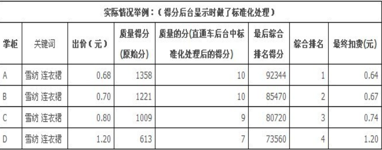 所以我们的质量得分越高越好。现在我估计同学们以及有疑问了?同样一个关键词,同样是10分,分时折扣都是一样的,为什么别人可以展示在我的前面,有3个原因,第一10分不是一个绝对值,10分之上还有很多小分值,比如1001和1999的差距是非常大的,同样是10分,同样的关键词,可能有的店铺需要出价1元,还抢不到排名,有的店铺同样10分,只需要5毛钱就可以卡到首条,就是因为他们的小分值不一样。大家可以看看下面这张图,然后根据我给大家说的公式算一算哦。